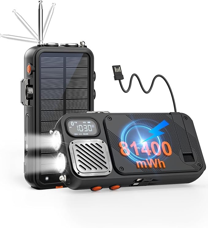 Stay prepared with this multi-function emergency radio featuring FM/NOAA alerts, a powerful 22000mAh solar power bank, and a hand crank for backup charging. It supports 20W fast charge, wireless phone charging, and Bluetooth music playback. With an SOS flashlight included, it’s an essential tool for home, travel, and outdoor emergencies.