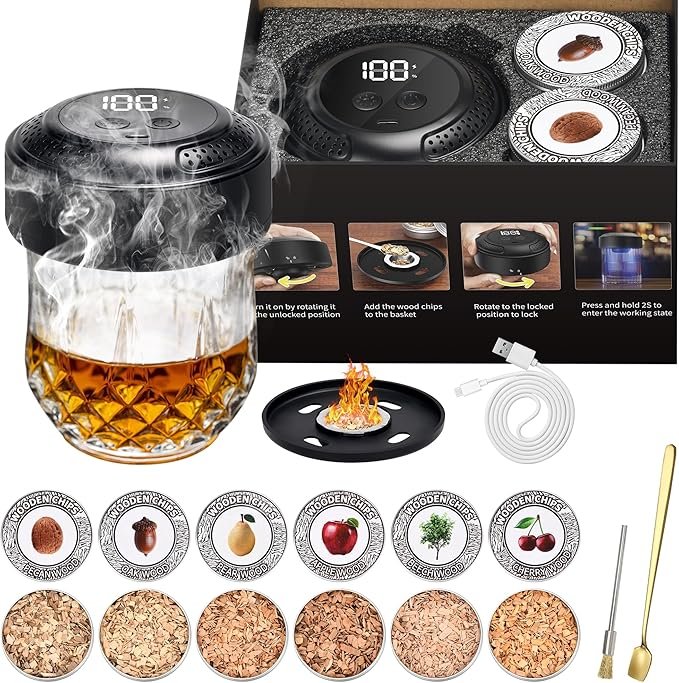 Elevate your cocktails with this rechargeable whiskey smoker, perfect for bourbon, old fashioned, and signature drinks. It comes with 6 premium wood chips and a built-in flameless lighter for effortless smoking. Compact and easy to use, it adds rich aroma and flavor, making every drink a unique experience.