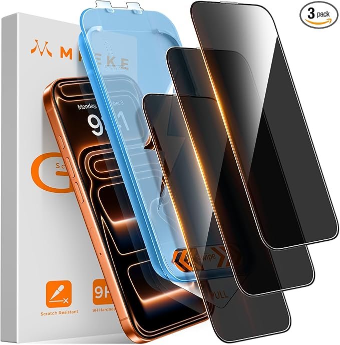 This Mkeke privacy screen protector offers 9H+ tempered glass strength with 16FT military-grade drop protection. Designed for the iPhone 17 Pro 6.3″, it provides full edge coverage while keeping your screen safe from scratches and prying eyes. The 3-pack ensures long-lasting protection and reliable use through daily wear.